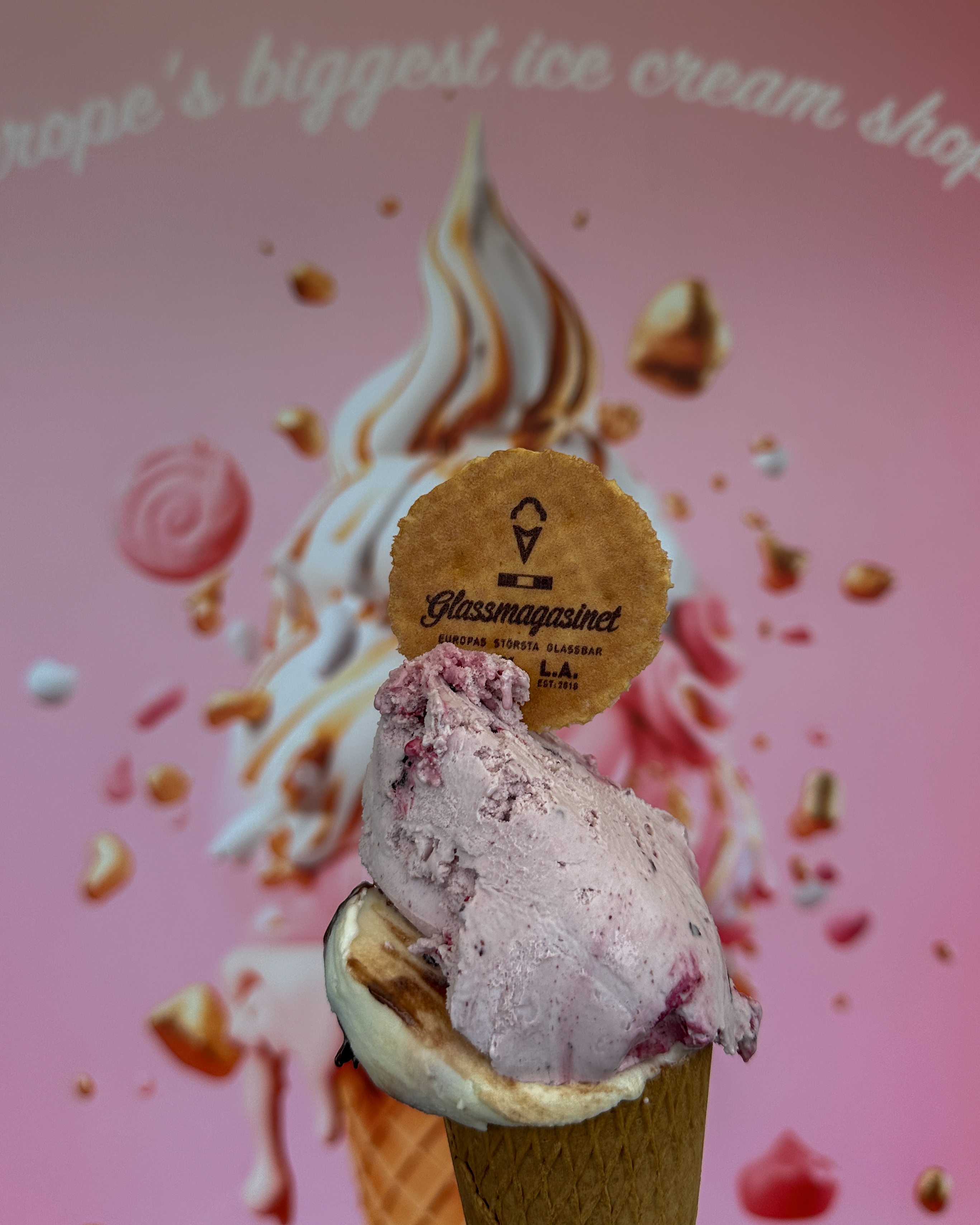 Glassmagasinet: Über 300 Sorten Eis – von Lakritz bis Champagner. Wir entschieden uns für eine wilde Mischung und ein Pippi Langstrumpf Eis, das wir unter dem Vordach schleckten, während der Regen leise auf das Pflaster trommelte.